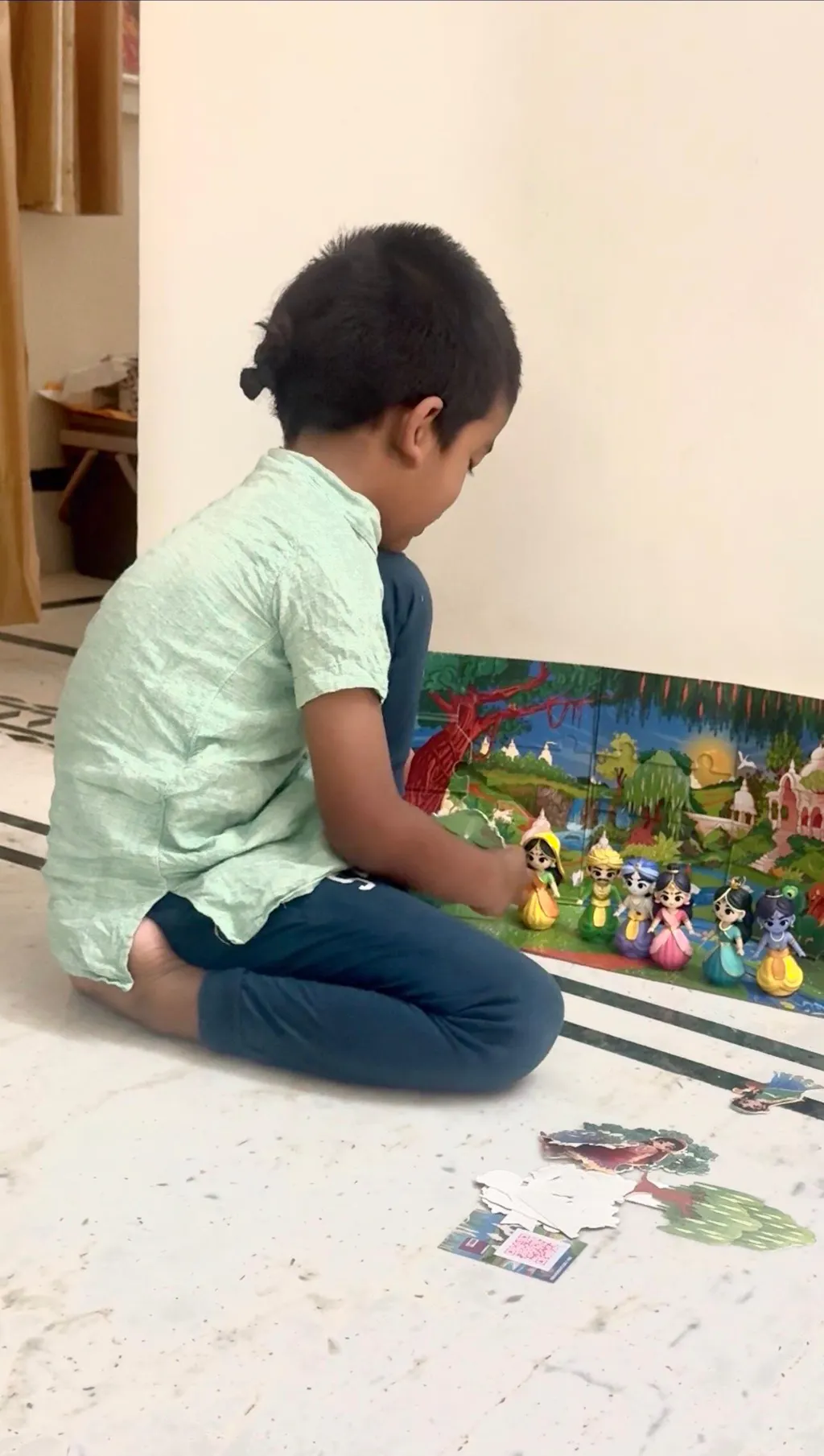 The toy set is interactive. Chikdren performs devotional service by acting out krishna-lila (smaranam), listening, playing, voicing, building the scene, cutting and laying out the characters. They can get creative and go even further by shooting stop-motion cartoons with you and participating in contests.