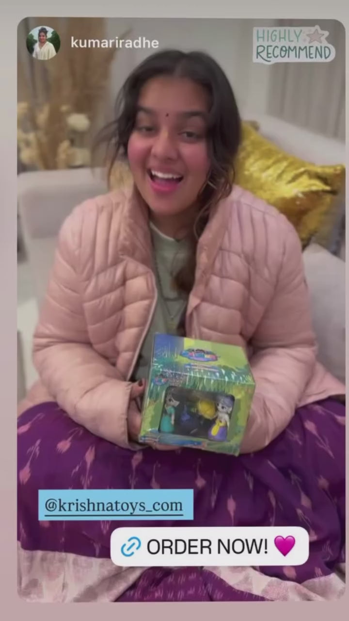 The set includes a unique e-book with role-based mini-performances for your toys. Just read the lines and act them out — turning playtime into joyful spiritual theater. It helps parents engage meaningfully, while kids naturally learn about Krishna through fun and play.